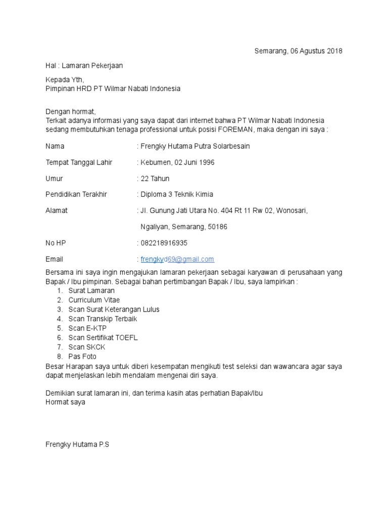 Contoh surat lamaran kerja pt nabati Surat Lamaran Pt Wilmar Nabati Indonesia