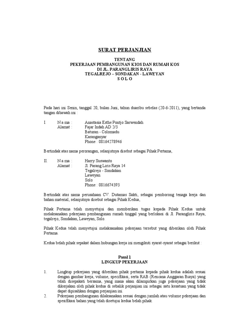 Surat perjanjian kerja borongan tukang doc Contoh Surat Perjanjian Tentang Pekerjaan Pembangunan Kios Dan Rumah Kos